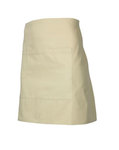 Above the knee length short waisted apron. 65% Polyester 35% Cotton Twill fabric. Unique styling. New towel loop at back of apron. 1 large central front pocket with special side slide pen & bottle opener provision. One size (86cm x 50cm)