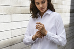Garment washed for added softness and easy minimal ironing Ladies style features semi-fitted silhouette, with shirt tail hem and back box pleat Can be worn tucked in or out |