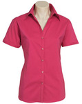 60% Cotton 35% Polyester 5% Elastane. Open neckline with slimline placket. Cuffed short sleeve stretch shirt. Curved hemline. Ladies semi-fitted shirt. Co-ordinates with Mens Metro shirts.